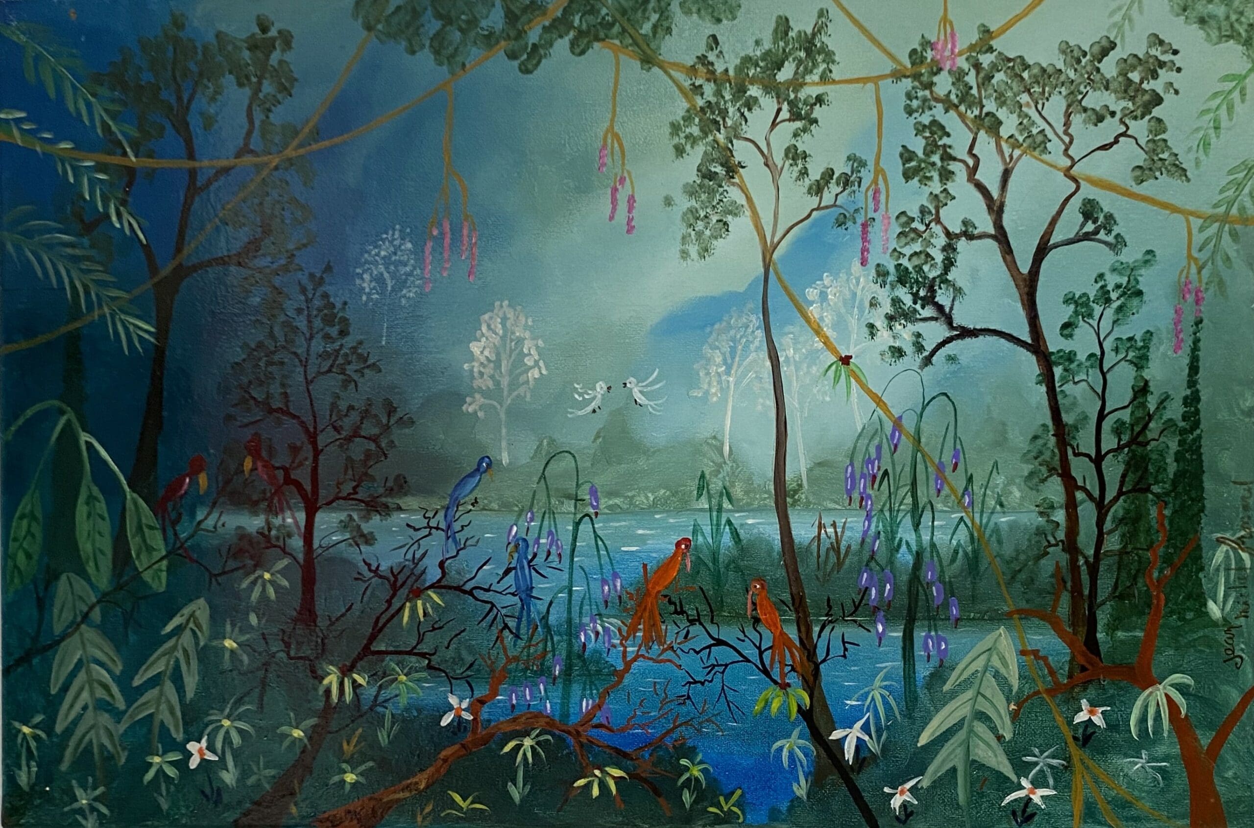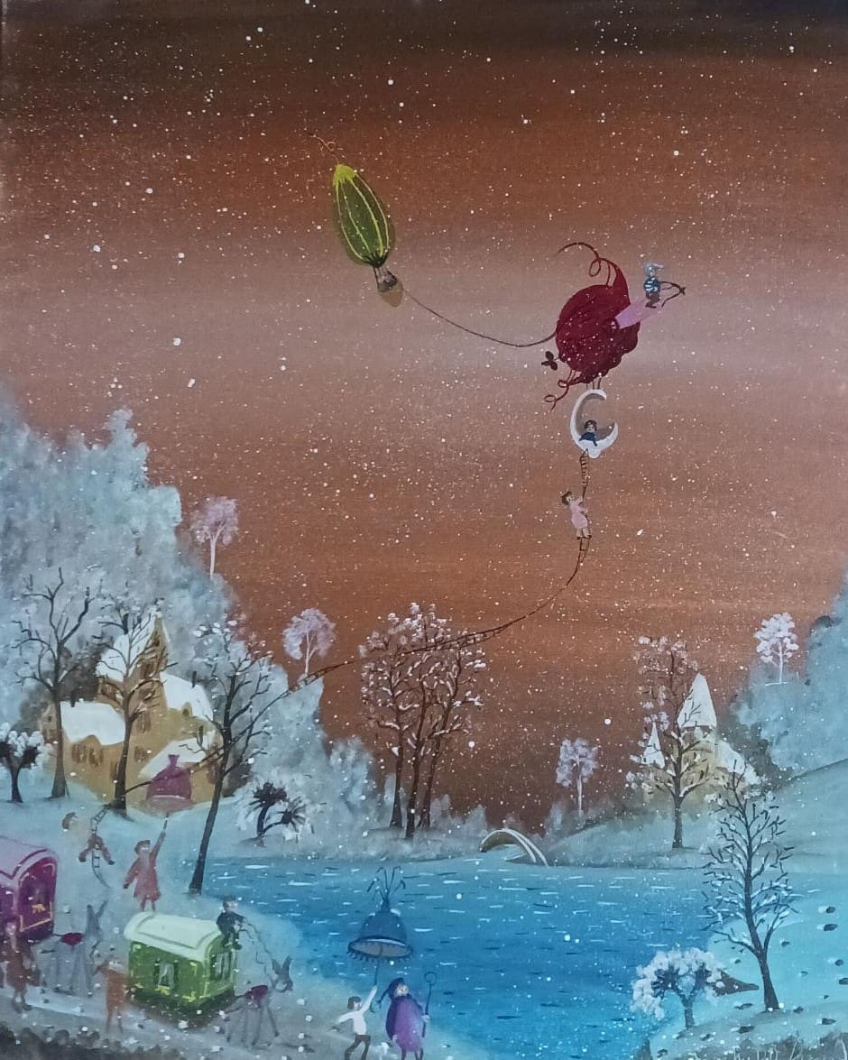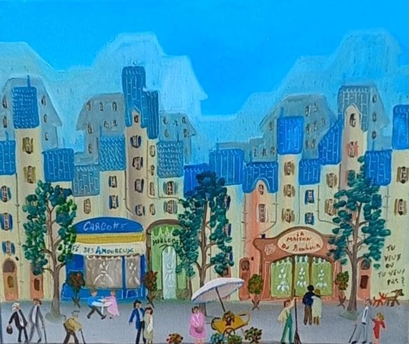 Sa peinture s’inscrit dans le mouvement de l’art naïf, les perspectives, les couleurs et la précision du trait ne respecte pas les règles conventionnelles. Ces œuvres nous transportent dans un monde magique et nous invitent à raconter une histoire.